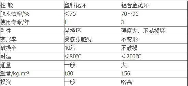 鋁花環(huán)填料主要應(yīng)用于TRT發(fā)電機(jī)組中噴堿塔以及鋼鐵廠高爐煤氣清洗中的脫水器,也可用于化工廠中的填料塔中。在煤氣脫水器中使用后煤氣中的機(jī)械水脫除到7g/Nm3。在鋼鐵廠二文填料脫水器中,與所用塑料花環(huán)相比,金屬花環(huán)填料增加,不易膨脹脆裂。鋁合金金屬花環(huán)填料作為材質(zhì)填料,在脫水性能、使用壽命等方面都比塑料花環(huán)明顯優(yōu)越(性能對比見表)。